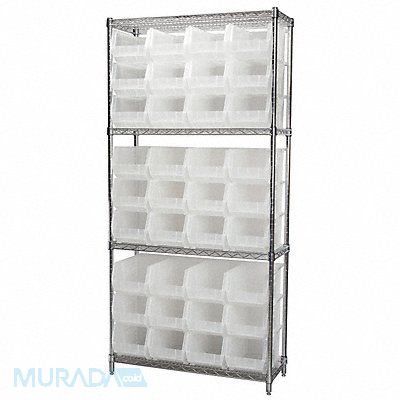 D5519 Bin Shelving Bin Style Hang and Stack Bin Material Polymer (36) 7 in x 8 1/4 in x 14 3/4 in Bin HxWxD Bin Height 7 in Bin Front Type Open Bin Depth 14 3/4 in Bin Color Clear Frame Material Steel NSF Frame Color Silver Chrome Includes Bins Yes Bin Width 8 1/4 in Includes 30240 Load Capacity per Shelf 500 lb Mobility Stationary Number of Bins 36 Number of Shelves 4 Number of Usable Sides 1 Overall Depth 14 in Overall Height 74 in Overall Width 36 in Chrome Shelf Finish