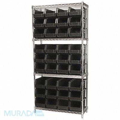 D5519 Bin Shelving Bin Style Hang and Stack Bin Material Polymer (36) 7 in x 8 1/4 in x 14 3/4 in Bin HxWxD Bin Height 7 in Bin Front Type Open Bin Depth 14 3/4 in Bin Color Black Frame Material Steel NSF Frame Color Silver Chrome Includes Bins Yes Bin Width 8 1/4 in Includes 30240 Load Capacity per Shelf 500 lb Mobility Stationary Number of Bins 36 Number of Shelves 4 Number of Usable Sides 1 Overall Depth 14 in Overall Height 74 in Overall Width 36 in Chrome Shelf Finish