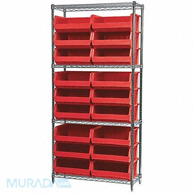 D5521 Bin Shelving Bin Style Hang and Stack Bin Material Polymer (18) 7 in x 16 1/2 in x 14 3/4 in Bin HxWxD Bin Height 7 in Bin Front Type Open Bin Depth 14 3/4 in Bin Color Red Frame Material Steel NSF Frame Color Silver Chrome Includes Bins Yes Bin Width 16 1/2 in Includes 30250 Load Capacity per Shelf 500 lb Mobility Stationary Number of Bins 18 Number of Shelves 4 Number of Usable Sides 1 Overall Depth 14 in Overall Height 74 in Overall Width 36 in Chrome Shelf Finish