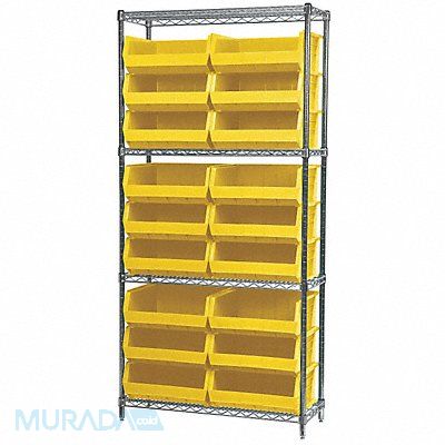 D5521 Bin Shelving Bin Style Hang and Stack Bin Material Polymer (18) 7 in x 16 1/2 in x 14 3/4 in Bin HxWxD Bin Height 7 in Bin Front Type Open Bin Depth 14 3/4 in Bin Color Yellow Frame Material Steel NSF Frame Color Silver Chrome Includes Bins Yes Bin Width 16 1/2 in Includes 30250 Load Capacity per Shelf 500 lb Mobility Stationary Number of Bins 18 Number of Shelves 4 Number of Usable Sides 1 Overall Depth 14 in Overall Height 74 in Overall Width 36 in Chrome Shelf Finish