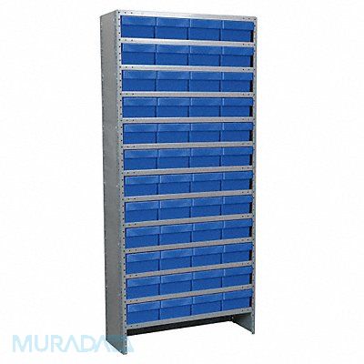 Enclosed Bin Shelving Bin Style Drawer Bin Material Polymer (48) 4 5/8 in x 8 3/8 in x 11 5/8 in Bin HxWxD Bin Height 4 5/8 in Bin Front Type Closed Bin Depth 11 5/8 in Bin Color Blue Frame Material Steel Frame Color Gray Powder Coated Includes Bins Yes Bin Width 8 3/8 in Includes 31188 Load Capacity per Shelf 550 lb Mobility Stationary Number of Bins 48 Number of Shelves 13 Number of Usable Sides 1 Overall Depth 18 in Overall Height 79 in Overall Width 36 in