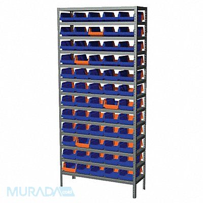 K6926 Bin Shelving Bin Style Indicator Bin Material Polymer (60) 4 in x 6 3/4 in x 11 5/8 in Bin HxWxD Bin Height 4 in Bin Front Type Open Bin Depth 11 5/8 in Bin Color Blue Orange Frame Material Steel Frame Color Gray Powder Coated Includes Bins Yes Bin Width 6 3/4 in Includes 36462 Load Capacity per Shelf 500 lb Mobility Stationary Number of Bins 60 Number of Shelves 13 Number of Usable Sides 1 Overall Depth 12 in Overall Height 79 in Overall Width 36 in
