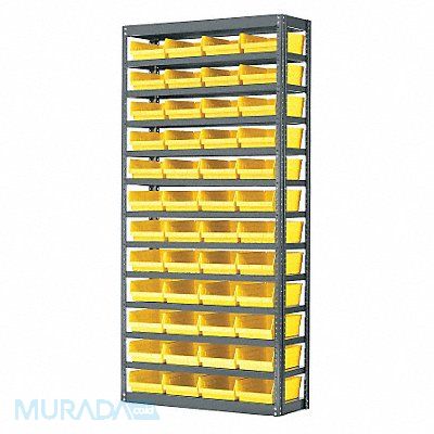 Bin Shelving Bin Style Shelf Bin Material Polymer (48) 4 in x 8 3/8 in x 11 5/8 in Bin HxWxD Bin Height 4 in Bin Front Type Open Bin Depth 11 5/8 in Bin Color Yellow Frame Material Steel Frame Color Gray Powder Coated Includes Bins Yes Bin Width 8 3/8 in Includes 30150 Load Capacity per Shelf 500 lb Mobility Stationary Number of Bins 48 Number of Shelves 13 Number of Usable Sides 1 Overall Depth 12 in Overall Height 79 in Overall Width 36 in Powder Coated Shelf Finish