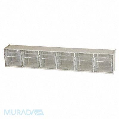 Tip-Out Bin Frame Color Beige Frame Finish Unfinished Mounting Location Frame Panel Rail Wall Overall Height 4 1/2 in Overall Length 3 3/4 in Overall Width 23 5/8 in Stackable Yes Volume Capacity 0.19 cu ft Weight Capacity 15 lb Number of Shelves 1 Number of Tiers 1 Bin Color Clear Bin Inside Depth 2 1/2 in Bin Inside Height 3 3/4 in Bin Inside Width 3 in Divider Adjustment Increments Not Applicable Includes Dividers No Material Plastic Mobility Stationary Number of Bins 6