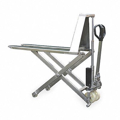 Manual High-Lift Pallet Jack Load Capacity 2 200 lb Lift Mechanism Hydraulic Lift Control Hand Pump Width Across Forks 27 in Width Between Forks 14 1/2 in Fork Style Standard Fork Type Fixed Scissor Type Supported Base Maximum Lifting Height 31 1/2 in Frame Material Stainlesss Steel Base Inside Width 14 1/2 in Base Outside Width 27 in For Pallet Type Open Fork Length 46 in Fork Width 6 1/2 in Overall Height 48 1/2 in Overall Length 61 3/4 in Overall Width 27 in