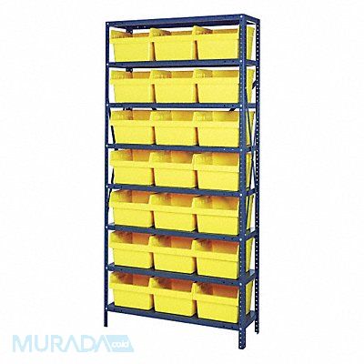G7421 Bin Shelving Bin Style Shelf Bin Material Polypropylene (21) 8 in x 11 1/8 in x 11 5/8 in Bin HxWxD Bin Height 8 in Bin Front Type Open Bin Depth 11 5/8 in Bin Color Yellow Frame Material Steel NSF Frame Color Gray Powder Coated Includes Bins Yes Bin Width 11 1/8 in Includes QSB809YL Load Capacity per Shelf 400 lb Number of Bins 21 Number of Shelves 8 Number of Usable Sides 1 Overall Depth 12 in Overall Height 75 in Overall Width 36 in Powder Coated Shelf Finish
