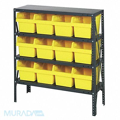 G7424 Bin Shelving Bin Style Shelf Bin Material Polypropylene (12) 6 in x 8 3/8 in x 11 5/8 in Bin HxWxD Bin Height 8 in Bin Front Type Open Bin Depth 17 7/8 in Bin Color Yellow Frame Material Steel NSF Frame Color Gray Powder Coated Includes Bins Yes Bin Width 8 3/8 in Includes QSB803YL Load Capacity per Shelf 400 lb Number of Bins 12 Number of Shelves 4 Number of Usable Sides 1 Overall Depth 18 in Overall Height 39 in Overall Width 36 in Powder Coated Shelf Finish