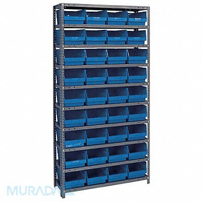 G6988 Bin Shelving Bin Style Shelf Bin Material Polypropylene (36) 6 in x 8 3/8 in x 11 5/8 in Bin HxWxD Bin Height 6 in Bin Front Type Open Bin Depth 11 5/8 in Bin Color Blue Frame Material Steel NSF Frame Color Gray Powder Coated Includes Bins Yes Bin Width 8 3/8 in Includes QSB207BL Load Capacity per Shelf 400 lb Number of Bins 36 Number of Shelves 10 Number of Usable Sides 1 Overall Depth 12 in Overall Height 75 in Overall Width 36 in Powder Coated Shelf Finish