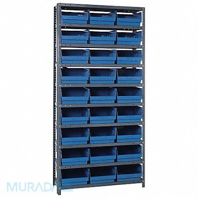 G6989 Bin Shelving Bin Style Shelf Bin Material Polypropylene (27) 6 in x 11 1/8 in x 11 5/8 in Bin HxWxD Bin Height 6 in Bin Front Type Open Bin Depth 11 5/8 in Bin Color Blue Frame Material Steel NSF Frame Color Gray Powder Coated Includes Bins Yes Bin Width 11 1/8 in Includes QSB209BL Load Capacity per Shelf 400 lb Number of Bins 27 Number of Shelves 10 Number of Usable Sides 1 Overall Depth 12 in Overall Height 75 in Overall Width 36 in Powder Coated Shelf Finish