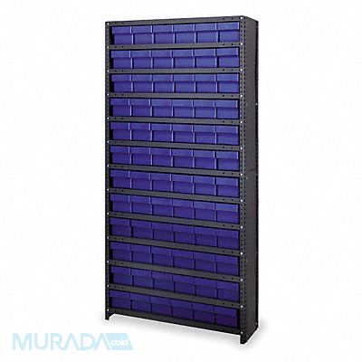 D5599 Enclosed Bin Shelving Bin Style Drawer Bin Material Polystyrene (72) 4 5/8 in x 5 9/16 in x 17 5/8 in Bin HxWxD Bin Height 4 5/8 in Bin Front Type Closed Bin Depth 17 7/8 in Bin Color Blue Frame Material Steel Frame Color Gray Powder Coated Includes Bins Yes Bin Width 5 9/16 in Includes 1NTT5 Load Capacity per Shelf 400 lb Number of Bins 72 Number of Shelves 13 Number of Usable Sides 1 Overall Depth 18 in Overall Height 75 in Overall Width 36 in Powder Coated Shelf Finish