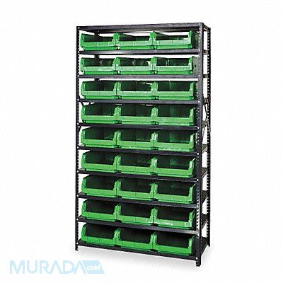E1528 Bin Shelving Bin Style Stacking Bin Material Polyethylene (27) 5 7/8 in x 12 3/8 in x 19 3/4 in Bin HxWxD Bin Height 5 7/8 in Bin Front Type Open Bin Depth 19 3/4 in Bin Color Green Frame Material Steel NSF Frame Color Gray Powder Coated Includes Bins Yes Bin Width 12 3/8 in Includes QMS531GN Load Capacity per Shelf 350 lb Number of Bins 27 Number of Shelves 10 Number of Usable Sides 1 Overall Depth 18 in Overall Height 75 in Overall Width 42 in Powder Coated Shelf Finish