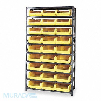 E1528 Bin Shelving Bin Style Stacking Bin Material Polyethylene (27) 5 7/8 in x 12 3/8 in x 19 3/4 in Bin HxWxD Bin Height 5 7/8 in Bin Front Type Open Bin Depth 19 3/4 in Bin Color Yellow Frame Material Steel NSF Frame Color Gray Powder Coated Includes Bins Yes Bin Width 12 3/8 in Includes QMS531YL Load Capacity per Shelf 350 lb Number of Bins 27 Number of Shelves 10 Number of Usable Sides 1 Overall Depth 18 in Overall Height 75 in Overall Width 42 in Powder Coated Shelf Finish