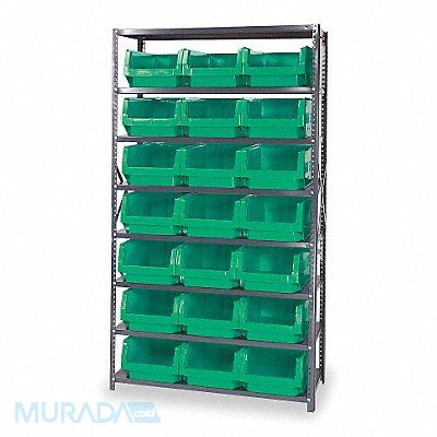 E1529 Bin Shelving Bin Style Stacking Bin Material Polyethylene (21) 7 7/8 in x 12 3/8 in x 19 3/4 in Bin HxWxD Bin Height 7 7/8 in Bin Front Type Open Bin Depth 19 3/4 in Bin Color Green Frame Material Steel NSF Frame Color Gray Powder Coated Includes Bins Yes Bin Width 12 3/8 in Includes QMS532GN Load Capacity per Shelf 350 lb Number of Bins 21 Number of Shelves 8 Number of Usable Sides 1 Overall Depth 18 in Overall Height 75 in Overall Width 42 in Powder Coated Shelf Finish