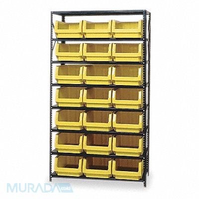 E1529 Bin Shelving Bin Style Stacking Bin Material Polyethylene (21) 7 7/8 in x 12 3/8 in x 19 3/4 in Bin HxWxD Bin Height 7 7/8 in Bin Front Type Open Bin Depth 19 3/4 in Bin Color Yellow Frame Material Steel NSF Frame Color Gray Powder Coated Includes Bins Yes Bin Width 12 3/8 in Includes QMS532YL Load Capacity per Shelf 350 lb Number of Bins 21 Number of Shelves 8 Number of Usable Sides 1 Overall Depth 18 in Overall Height 75 in Overall Width 42 in Powder Coated Shelf Finish
