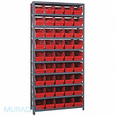 G6987 Bin Shelving Bin Style Shelf Bin Material Polypropylene (45) 6 in x 6 5/8 in x 11 5/8 in Bin HxWxD Bin Height 6 in Bin Front Type Open Bin Depth 11 5/8 in Bin Color Red Frame Material Steel NSF Frame Color Gray Powder Coated Includes Bins Yes Bin Width 6 5/8 in Includes QSB202RD Load Capacity per Shelf 400 lb Number of Bins 45 Number of Shelves 10 Number of Usable Sides 1 Overall Depth 12 in Overall Height 75 in Overall Width 36 in Powder Coated Shelf Finish