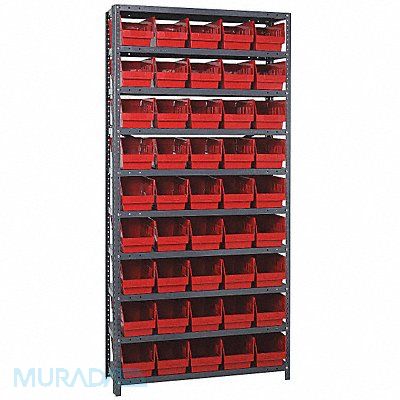 G6995 Bin Shelving Bin Style Shelf Bin Material Polypropylene (45) 6 in x 6 5/8 in x 17 7/8 in Bin HxWxD Bin Height 6 in Bin Front Type Open Bin Depth 17 7/8 in Bin Color Red Frame Material Steel NSF Frame Color Gray Powder Coated Includes Bins Yes Bin Width 6 5/8 in Includes QSB204RD Load Capacity per Shelf 400 lb Number of Bins 45 Number of Shelves 10 Number of Usable Sides 1 Overall Depth 18 in Overall Height 75 in Overall Width 36 in Powder Coated Shelf Finish