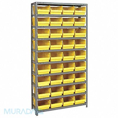 G6988 Bin Shelving Bin Style Shelf Bin Material Polypropylene (36) 6 in x 8 3/8 in x 11 5/8 in Bin HxWxD Bin Height 6 in Bin Front Type Open Bin Depth 11 5/8 in Bin Color Yellow Frame Material Steel NSF Frame Color Gray Powder Coated Includes Bins Yes Bin Width 8 3/8 in Includes QSB207YL Load Capacity per Shelf 400 lb Number of Bins 36 Number of Shelves 10 Number of Usable Sides 1 Overall Depth 12 in Overall Height 75 in Overall Width 36 in Powder Coated Shelf Finish