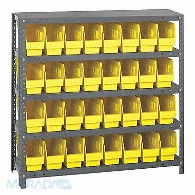 G6982 Bin Shelving Bin Style Shelf Bin Material Polypropylene (32) 6 in x 4 1/8 in x 11 5/8 in Bin HxWxD Bin Height 6 in Bin Front Type Open Bin Depth 11 5/8 in Bin Color Yellow Frame Material Steel NSF Frame Color Gray Powder Coated Includes Bins Yes Bin Width 4 1/8 in Includes QSB201YL Load Capacity per Shelf 400 lb Number of Bins 32 Number of Shelves 5 Number of Usable Sides 1 Overall Depth 12 in Overall Height 39 in Overall Width 36 in Powder Coated Shelf Finish