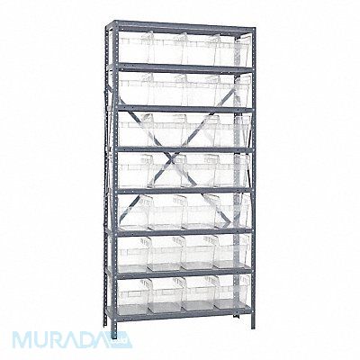 G7420 Bin Shelving Bin Style Shelf Bin Material Polypropylene (28) 8 in x 8 3/8 in x 11 5/8 in Bin HxWxD Bin Height 8 in Bin Front Type Open Bin Depth 11 5/8 in Bin Color Clear Frame Material Steel FDA Approved Frame Color Gray Powder Coated Includes Bins Yes Bin Width 8 3/8 in Includes QSB807CL Load Capacity per Shelf 400 lb Number of Bins 28 Number of Shelves 8 Number of Usable Sides 1 Overall Depth 12 in Overall Height 75 in Overall Width 36 in Powder Coated Shelf Finish