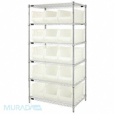 Bin Shelving Bin Style Hang and Stack Bin Material Polypropylene (15) 10 in x 11 in x 23 7/8 in Bin HxWxD Bin Height 10 in Bin Front Type Open Bin Depth 23 7/8 in Bin Color Clear Frame Material Steel NSF Frame Color Silver Chrome Includes Bins Yes Bin Width 11 in Includes QUS953CL Load Capacity per Shelf 800 lb Number of Bins 15 Number of Shelves 6 Number of Usable Sides 1 Overall Depth 24 in Overall Height 74 in Overall Width 36 in Chrome Shelf Finish Steel Shelf Material