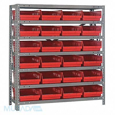 E1524 Bin Shelving Bin Style Shelf Bin Material Polypropylene (24) 4 in x 8 1/8 in x 17 7/8 in Bin HxWxD Bin Height 4 in Bin Front Type Open Bin Depth 17 7/8 in Bin Color Red Frame Material Steel NSF Frame Color Gray Powder Coated Includes Bins Yes Bin Width 8 1/8 in Includes QSB108RD Load Capacity per Shelf 400 lb Number of Bins 24 Number of Shelves 7 Number of Usable Sides 1 Overall Depth 18 in Overall Height 39 in Overall Width 36 in Powder Coated Shelf Finish
