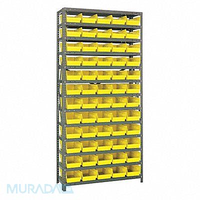 E1516 Bin Shelving Bin Style Shelf Bin Material Polypropylene (60) 4 in x 6 5/8 in x 17 7/8 in Bin HxWxD Bin Height 4 in Bin Front Type Open Bin Depth 17 7/8 in Bin Color Yellow Frame Material Steel NSF Frame Color Gray Powder Coated Includes Bins Yes Bin Width 6 5/8 in Includes QSB104YL Load Capacity per Shelf 400 lb Number of Bins 60 Number of Shelves 13 Number of Usable Sides 1 Overall Depth 18 in Overall Height 75 in Overall Width 36 in Powder Coated Shelf Finish