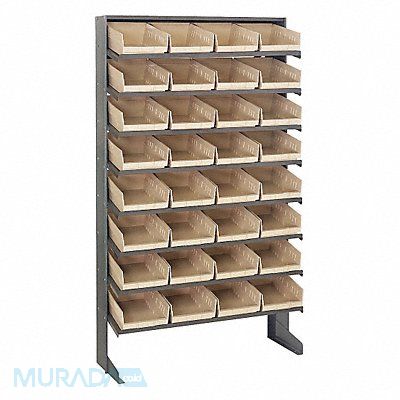 E1547 Pick Rack Bin Style Shelf Bin Material Polypropylene (32) 4 in x 8 3/8 in x 11 5/8 in Bin HxWxD Bin Height 4 in Bin Front Type Open Bin Depth 11 5/8 in Bin Color Ivory Frame Material Steel Frame Color Gray Powder Coated Includes Bins Yes Bin Width 8 3/8 in Includes QSB107IV Load Capacity per Shelf 50 lb Number of Bins 32 Number of Shelves 8 Number of Usable Sides 1 Overall Depth 12 in Overall Height 60 in Overall Width 36 in Powder Coated Shelf Finish Steel Shelf Material
