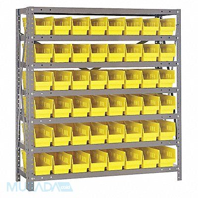 E1522 Bin Shelving Bin Style Shelf Bin Material Polypropylene (48) 4 in x 4 1/8 in x 17 7/8 in Bin HxWxD Bin Height 4 in Bin Front Type Open Bin Depth 17 7/8 in Bin Color Yellow Frame Material Steel NSF Frame Color Gray Powder Coated Includes Bins Yes Bin Width 4 1/8 in Includes QSB103YL Load Capacity per Shelf 55 lb Number of Bins 48 Number of Shelves 7 Number of Usable Sides 1 Overall Depth 18 in Overall Height 39 in Overall Width 36 in Powder Coated Shelf Finish