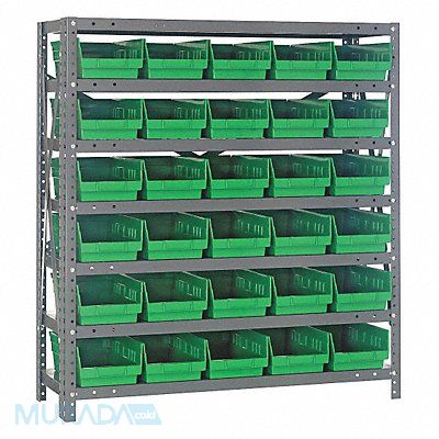 E1523 Bin Shelving Bin Style Shelf Bin Material Polypropylene (30) 4 in x 6 5/8 in x 17 7/8 in Bin HxWxD Bin Height 4 in Bin Front Type Open Bin Depth 17 7/8 in Bin Color Green Frame Material Steel NSF Frame Color Gray Powder Coated Includes Bins Yes Bin Width 6 5/8 in Includes QSB104GN Load Capacity per Shelf 55 lb Number of Bins 30 Number of Shelves 7 Number of Usable Sides 1 Overall Depth 18 in Overall Height 39 in Overall Width 36 in Powder Coated Shelf Finish