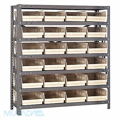 E1513 Bin Shelving Bin Style Shelf Bin Material Polypropylene (24) 4 in x 8 3/8 in x 11 5/8 in Bin HxWxD Bin Height 4 in Bin Front Type Open Bin Depth 11 5/8 in Bin Color Ivory Frame Material Steel NSF Frame Color Gray Powder Coated Includes Bins Yes Bin Width 8 3/8 in Includes QSB107IV Load Capacity per Shelf 400 lb Number of Bins 24 Number of Shelves 7 Number of Usable Sides 1 Overall Depth 12 in Overall Height 39 in Overall Width 36 in Powder Coated Shelf Finish