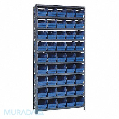 E1516 Bin Shelving Bin Style Shelf Bin Material Polypropylene (60) 4 in x 6 5/8 in x 17 7/8 in Bin HxWxD Bin Height 4 in Bin Front Type Open Bin Depth 17 7/8 in Bin Color Blue Frame Material Steel NSF Frame Color Gray Powder Coated Includes Bins Yes Bin Width 6 5/8 in Includes QSB104BL Load Capacity per Shelf 400 lb Number of Bins 60 Number of Shelves 13 Number of Usable Sides 1 Overall Depth 18 in Overall Height 75 in Overall Width 36 in Powder Coated Shelf Finish
