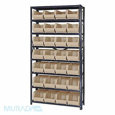 E1498 Bin Shelving Bin Style Hang and Stack Bin Material Polypropylene (28) 7 in x 8 1/4 in x 14 3/4 in Bin HxWxD Bin Height 7 in Bin Front Type Open Bin Depth 14 3/4 in Bin Color Ivory Frame Material Steel FDA Approved Frame Color Gray Powder Coated Includes Bins Yes Bin Width 8 1/4 in Load Capacity per Shelf 400 lb Number of Bins 28 Number of Shelves 8 Number of Usable Sides 1 Overall Depth 12 in Overall Height 75 in Overall Width 36 in Powder Coated Shelf Finish