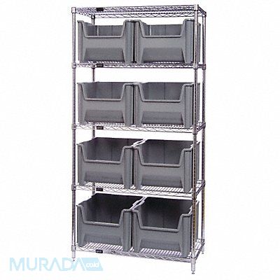 F1591 Bin Shelving Bin Style Hang and Stack Bin Material Polypropylene (8) 12 7/16 in x 19 7/8 in x 15 1/4 in Bin HxWxD Bin Height 12 7/16 in Bin Front Type Open Bin Depth 15 1/4 in Bin Color Blue Frame Material Steel NSF Frame Color Gray Chrome Includes Bins Yes Bin Width 19 7/8 in Includes QGH700BL Load Capacity per Shelf 160 lb Number of Bins 8 Number of Shelves 5 Number of Usable Sides 1 Overall Depth 18 in Overall Height 74 in Overall Width 42 in Chrome Shelf Finish