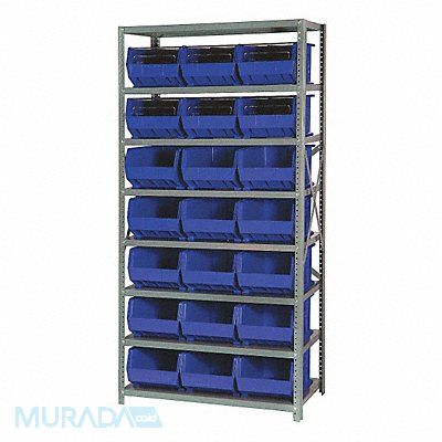 E1501 Bin Shelving Bin Style Hang and Stack Bin Material Polypropylene (21) 8 in x 11 in x 16 in Bin HxWxD Bin Height 8 in Bin Front Type Open Bin Depth 16 in Bin Color Blue Frame Material Steel FDA Approved Frame Color Gray Powder Coated Includes Bins Yes Bin Width 11 in Load Capacity per Shelf 400 lb Number of Bins 21 Number of Shelves 8 Number of Usable Sides 1 Overall Depth 18 in Overall Height 75 in Overall Width 36 in Powder Coated Shelf Finish Steel Shelf Material No