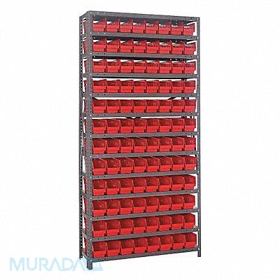 E1506 Bin Shelving Bin Style Shelf Bin Material Plastic (96) 4 in x 4 1/8 in x 11 5/8 in Bin HxWxD Bin Height 4 in Bin Front Type Open Bin Depth 11 5/8 in Bin Color Red Frame Material Steel NSF Frame Color Gray Powder Coated Includes Bins Yes Bin Width 4 1/8 in Includes QSB101RD Load Capacity per Shelf 400 lb Number of Bins 96 Number of Shelves 13 Number of Usable Sides 1 Overall Depth 12 in Overall Height 75 in Overall Width 36 in Powder Coated Shelf Finish Steel Shelf Material