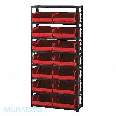 E1499 Bin Shelving Bin Style Hang and Stack Bin Material Polypropylene (24) 5 in x 16 1/2 in x 10 7/8 in Bin HxWxD Bin Height 5 in Bin Front Type Open Bin Depth 10 7/8 in Bin Color Red Frame Material Steel FDA Approved Frame Color Gray Powder Coated Includes Bins Yes Bin Width 16 1/2 in Load Capacity per Shelf 400 lb Number of Bins 24 Number of Shelves 7 Number of Usable Sides 1 Overall Depth 12 in Overall Height 75 in Overall Width 36 in Powder Coated Shelf Finish