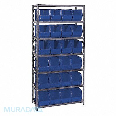 E1503 Bin Shelving Bin Style Hang and Stack Bin Material Polypropylene (24) 9 in x 8 1/4 in x 18 in Bin HxWxD Bin Height 9 in Bin Front Type Open Bin Depth 18 in Bin Color Blue Frame Material Steel FDA Approved Frame Color Gray Powder Coated Includes Bins Yes Bin Width 8 1/4 in Load Capacity per Shelf 400 lb Number of Bins 24 Number of Shelves 7 Number of Usable Sides 1 Overall Depth 18 in Overall Height 75 in Overall Width 36 in Powder Coated Shelf Finish Steel Shelf Material