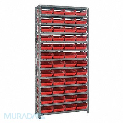 E1508 Bin Shelving Bin Style Shelf Bin Material Plastic (48) 4 in x 8 3/8 in x 11 5/8 in Bin HxWxD Bin Height 4 in Bin Front Type Open Bin Depth 11 5/8 in Bin Color Red Frame Material Steel NSF Frame Color Gray Powder Coated Includes Bins Yes Bin Width 8 3/8 in Includes QSB107RD Load Capacity per Shelf 400 lb Number of Bins 48 Number of Shelves 13 Number of Usable Sides 1 Overall Depth 12 in Overall Height 75 in Overall Width 36 in Powder Coated Shelf Finish Steel Shelf Material