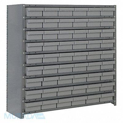 E7215 Enclosed Bin Shelving Bin Style Drawer Bin Material Polystyrene (54) 2 5/8 in x 5 9/16 in x 11 5/8 in Bin HxWxD Bin Height 2 5/8 in Bin Front Type Closed Bin Depth 11 5/8 in Bin Color Gray Frame Material Steel Frame Color Gray Powder Coated Includes Bins Yes Bin Width 5 9/16 in Load Capacity per Shelf 400 lb Number of Bins 54 Number of Shelves 10 Number of Usable Sides 1 Overall Depth 12 in Overall Height 39 in Overall Width 36 in Powder Coated Shelf Finish