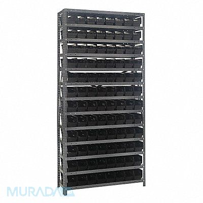 E1506 Bin Shelving Bin Style Shelf Bin Material Plastic (96) 4 in x 4 1/8 in x 11 5/8 in Bin HxWxD Bin Height 4 in Bin Front Type Open Bin Depth 11 5/8 in Bin Color Black Frame Material Steel NSF Frame Color Gray Powder Coated Includes Bins Yes Bin Width 4 1/8 in Includes QSB101BK Load Capacity per Shelf 400 lb Number of Bins 96 Number of Shelves 13 Number of Usable Sides 1 Overall Depth 12 in Overall Height 75 in Overall Width 36 in Powder Coated Shelf Finish