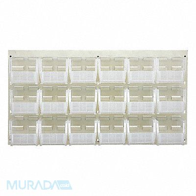 Louvered Panel Bin Color Clear Bin Depth 10 7/8 in Bin Height 5 in Bin Style Hang and Stack Bin Width 5 1/2 in Number of Bins 18 Overall Depth 1/4 in Overall Height 20 in Overall Width 36 in 175 lb Whole Unit Load Capacity Number of Sides 1 White Powder Coated Steel Louvered Panel Louvered Rack Style Model QLP-3619 Louvered Panel Model QUS230 Bins
