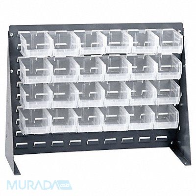 Louvered Bench Rack Bin Color Clear Bin Depth 5 3/8 in Bin Height 3 in Bin Style Hang and Stack Bin Width 4 1/8 in Number of Bins 24 Overall Depth 1/4 in Overall Height 21 in Overall Width 27 in 140 lb Whole Unit Load Capacity Number of Sides 1 Gray Powder Coated Steel Louvered Bench Rack Louvered Rack Style Model QBR-2721 Bench Rack and Model QUS210 Bins