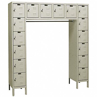 G3803 Box Locker Unit with Coat Rod Locker Door Type Louvered Unassembled Locker Configuration (6) Tier (6) Wide Number of Openings 16 Hooks per Opening None 9 1/4 in Opening Width Opening Depth 17 in Opening Height 10 1/2 in Overall Width 72 in Overall Depth 18 in Overall Height 78 in Color Tan Locker Material Steel Finish Powder Coated Legs Included Yes Locker Handle Type Pull Locker Lock Type Accommodates Built-In Lock or Padlock Includes Number Plates with Mounting Hardware