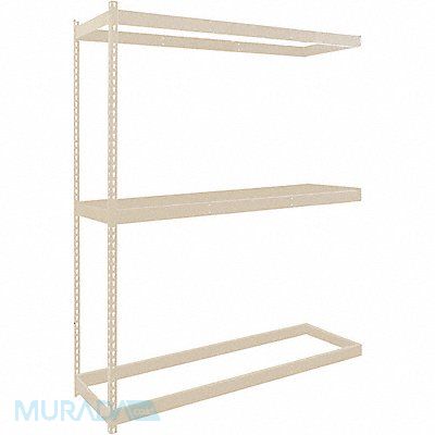 Boltless Shelving Angle Overall Depth 48 in Overall Height 84 in Overall Width 48 in Shelf Gauge 14 ga Shelf Adjustment Increments 1 1/2 in Steel None Steel Includes Decking No Includes Mounting Hardware No 750 lb Whole Unit Load Capacity 2 250 lb Add-On Open Post Gauge 14 ga Number of Shelves 3 Floor Mount Wall Mount Maximum Post Load Capacity 825 lb with Beams Evenly Spaced at 42 in Powder Coated Light-Duty Tan