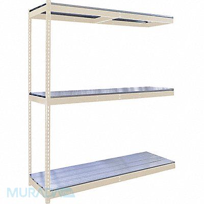 Boltless Shelving Channel Overall Depth 48 in Overall Height 84 in Overall Width 72 in Shelf Gauge 22 ga Shelf Adjustment Increments 1 1/2 in Steel Steel Steel Center Support Includes Decking Yes Includes Mounting Hardware No 685 lb Whole Unit Load Capacity 2 055 lb Add-On Open Post Gauge 14 ga Number of Shelves 3 Floor Mount Wall Mount Maximum Post Load Capacity 2 055 lb with Beams Evenly Spaced at 42 in Powder Coated Heavy-Duty Tan