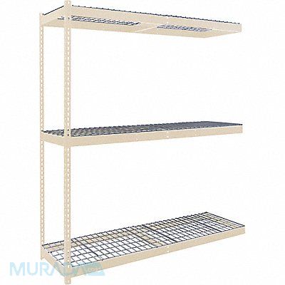 Boltless Shelving Channel Overall Depth 24 in Overall Height 84 in Overall Width 96 in Shelf Gauge 4 ga Shelf Adjustment Increments 1 1/2 in Steel Steel Steel Center Support Includes Decking Yes Includes Mounting Hardware No 1 200 lb Whole Unit Load Capacity 3 600 lb Add-On Open Post Gauge 14 ga Number of Shelves 3 Floor Mount Wall Mount Maximum Post Load Capacity 3 600 lb with Beams Evenly Spaced at 42 in Powder Coated Heavy-Duty Tan