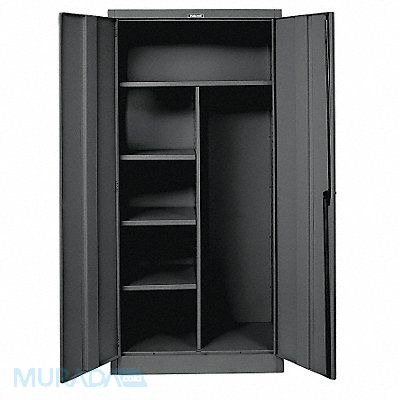 K4193 Storage Cabinet Base Type Frame Body Panel Type Solid Cabinet Color Black Cabinet Material Steel Cabinet Storage Components Hanging Rods Shelves Door Handle Type Swing Door Type Solid Duty Rating Medium Duty For Use Indoors/Outdoors No Frame Assembled Unassembled Load Capacity per Shelf 250 lb Lock Type Keyed Mobility Stationary Mounting Location Freestanding Number of Shelves 4 Overall Depth 18 in Overall Height 78 in Overall Width 48 in Audit Trail Storage None