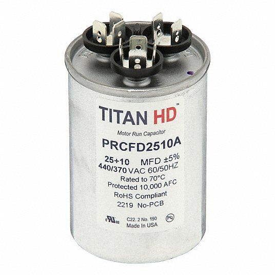 Motor Dual Run Capacitor Motor Dual Run Capacitor Round 440/370V AC Microfarad Rating 25/10 Overall Height 3 13/32 in Case Material Aluminum