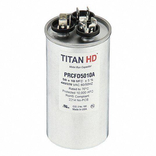Motor Dual Run Capacitor Motor Dual Run Capacitor Round 440/370V AC Microfarad Rating 50/10 Overall Height 4 11/32 in Case Material Aluminum