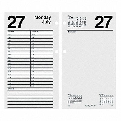 White Daily Desk Pad Refill Format Saturday/Sunday on Two-Page Spread One Weekday Per Two-Page Spread Sheet Size 4 1/2 in x 8 in Color White Pages Features 7 AM to 5 15 PM 15 Minute Appointment Ruling on Left Page Base Sold Separately. Unruled Right Page
